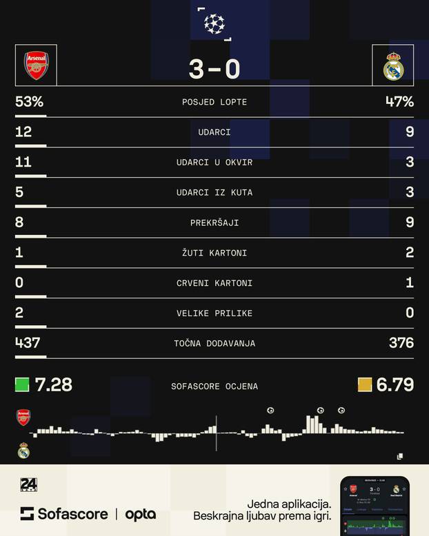 Belgijanac se iskupio u 67. minuti s dvije sjajne intervencije obranivši udarce Martinellija i Merina, a kada je već bio svladan, s crte je Alaba počistio udarac Rice. No, u 70. minuti gosti nisu mogli ništa. Ponovo je Rice pucao iz slobodnjaka i ponovo fantastično pogodio za 2-0. Fantastična večer Arsenala nastavila se u 75. minuti kada je Merino sa 14-15 metara pogodio za velikih 3-0.