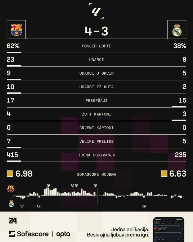 Barcelona je fantastično uzvratila postigavši čak četiri gola u razmaku od 26 minuta. Eric Garcia je smanjio u 19. minuti, u 32. je izjednačio Lamine Yamal, da bi Brazilac Raphinha golovima u 34. i 45, minuti preokrenuo rezultat.