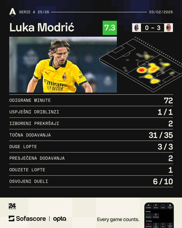 Luka Modrić odigrao je 72. minute utakmice, dirigirao veznim redom Milana i pokazao standardno dobru predstavu u dresu 'rossonera'. Nikola Moro ušao je u igru za Bolognu u 65. minuti utakmice.