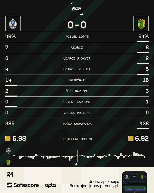 Utakmica se u samom finišu otvorila pa su odličnu šansu za sva tri boda imali i gosti. U 91. minuti je pucao Rozić s deset metara, ali se tada istaknuo domaći vratar Šubarić odličnom reakcijom čime je dvoboj zaključen bez golova. (Hina)
