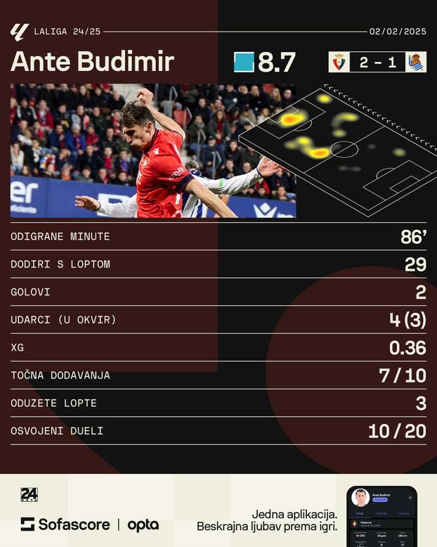 Ante Budimir još jednom je namjestio nišanske sprave, hrvatski reprezentativac bio je dvostruki strijelac u pobjedi Osasune (2-1) nad Real Sociedadom. Riječ je o dvoboju 22. kola španjolske La Lige, dvoboju koj se na El Sadaru odigrao pred 21.678 gledatelja. Budimir je gol odluke postigao već u 34. minuti kad je lijevom nogom "probio" gostujućeg vratara, dok je u 74. minuti na drugoj vratnici zabio glavom.