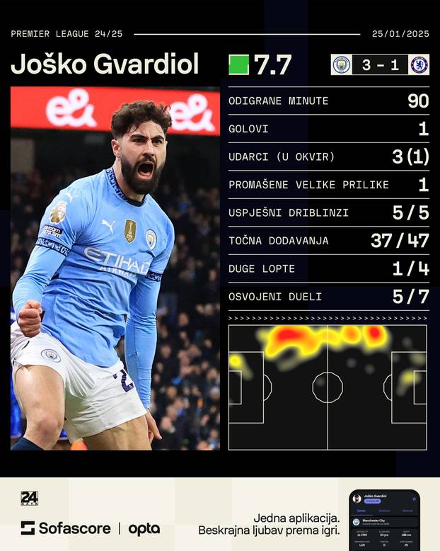 Komentari 24Nogometaši Manchester Cityja pobijedili su Chelsea 3-1 u derbiju 23. kola Premier lige. 'Građani' su slavili velikim preokretom, a strijelac pogotka za izjednačenje bio je Joško Gvardiol!