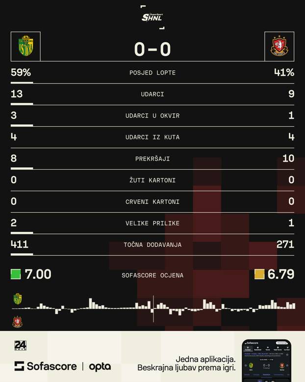 Gosti u prvom dijelu nisu uputili niti jedan udarac u okvir suparničkog gola. Međutim, već na samo otvaranju nstavka imali su lijepu priliku, ali je Filip Čuić bio neprecizan.
