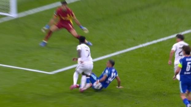 Timothy Weah doveo je Marseille u prednost, da bi vrlo brzo Peljto dosudio prvi penal za Real nakon što je Kondogbia srušio Rodryga. Mbappé je bio precizan i s 1-1 se otišlo na odmor. U nastavku Real nikako nije uspio slomiti Francuze, a onda šok. Dani Carvajal glavom udara golmana Rullija i Peljto nakon gledanja VAR-a pokazuje Španjolcu izravan crveni karton. Ipak, Real se "izvukao" i to novim penalom kojeg je dosudio bosanskohercegovački sudac. Murillo je uklizao u blok, lopta mu se nekontrolirano odbija u ruku, a Peljto pokazuje na novi penal za "kraljeve".