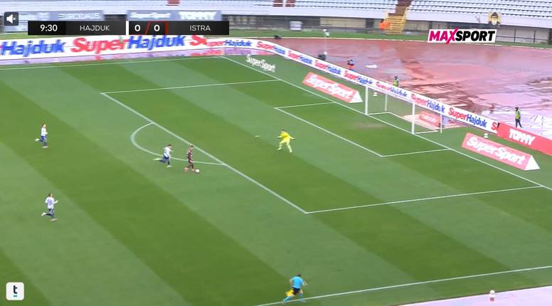 Domaćin je izgubio loptu u napadu, a onda je krenula brza kontra gostiju. Lončar je primio dodavanje iz obrane, povukao pa sjajno dubinski proigrao Prevljaka koji bježi obrani Hajduka i mirno zabija za 0-1.