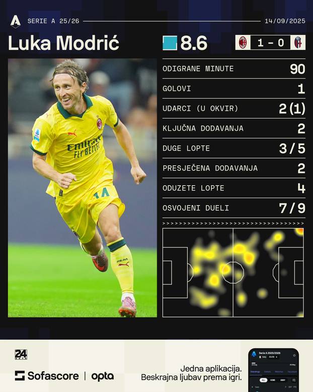 Utakmica Luke Modrića protiv Bologne u kojoj je zabio jedini gol za Milan i postao najstariji strijelac među veznjacima u povijesti Serie A izazvala je val oduševljenja na Čizmi. Luka je došao u klub koji je favorizirao u djetinjstva nakon što mu Real Madrid nije htio ponuditi još jedno produljenje ugovora do Svjetskog prvenstva 2026., a to su iskoristili na San Siru.
