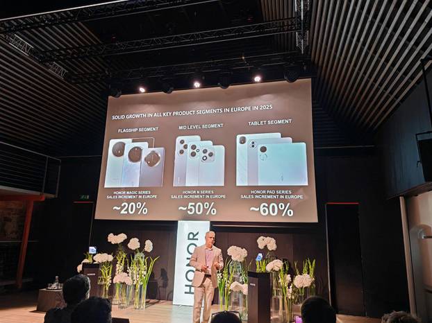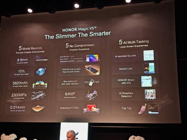 HONOR je sinoć u Ljubljani premijerno predstavio svoj novi sklopivi pametni telefon Magic V5 i tablet Pad 10. Magic V5 HONOR opisuje kao najtanji telefon na svijetu s unutarnjim sklopivim zaslonom, debljina mu je 8,8 mm i težina 217 grama. Uređaj pokreće Qualcomm Snapdragon 8 Elite platforma, a dolazi s baterijom kapaciteta 5820 mAh i trostrukim sustavom kamera: glavnom od 50 MP, ultraširokom od 50 MP i periskopskom telefoto kamerom od 64 MP.