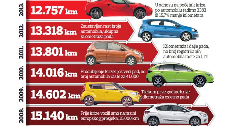 Više je drugih automobila u obitelji, više je novih vozača koji do sada nisu imali automobile, tako da se kilometraža na taj način preraspodijelila. Ipak, vozači svih osobnih automobila u Hrvatskoj su 2008. napravili malo više od 20 milijardi kilometara, a ukupna količina prijeđenih kilometara za 2013. godinu samo je neznatno veća od 18 milijardi. Pad od 10% jasno upućuje kako se sve manje vozimo osobnim automobilima. Razlozi za to su jasni - nedostatak novca te sve viša cijena goriva. Njegova cijena se te godine kretala između otprilike 6,5 i 9 kuna po litri, a danas je i do 50% veća. S obzirom na to da plaće od tada uglavnom nisu osjetno rasle i da su mnogi ljudi ostali bez posla, jasno je da se sve češće odričemo vožnje.