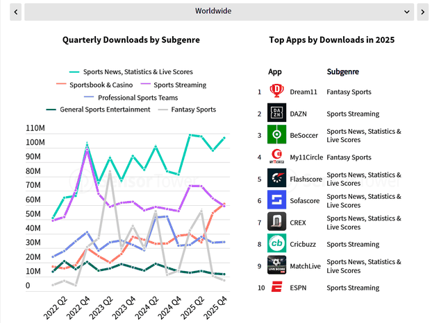 Novo izvješće Sensor Towera pokazuje da je Sofascore i u 2025. ostao među najskidanijim sportskim aplikacijama na svijetu, i to na 6. mjestu. Još važnije, po mjesečno aktivnim korisnicima je 5., a po rastu baze korisnika 3. globalno, što sugerira da aplikacija i dalje hvata zamah.